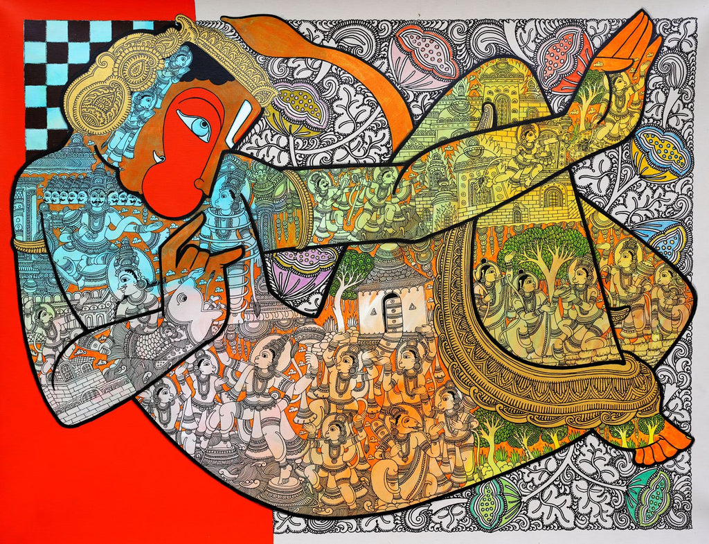 Born in 1979, in Kalahasti, Ramesh Gorjala shares his birthplace with that of Kalamkari style. Though he earned his BFA and MFA from Jawaharlal Nehru Technological University, Hyderabad, Ramesh was introduced to art at a much younger age. His parents were weavers and his uncle is a national award winning Kalamkari artist, this is where Ramesh’s informal art education began.