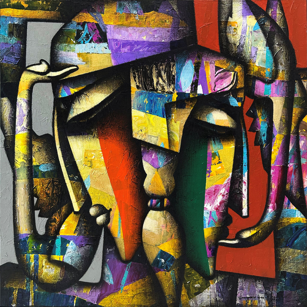 His art is deeply influenced by cubism of the post modern era. Solid blocks of bright colours; red, yellow, and orange is the signature style of Jagannath. Then the deep dark lines of charcoal, start structuring the figurative forms of men and women in his paintings. Thus adding a touch of drama, similar to how kohl adds structure and drama and enhances the beauty of a woman’s eyes. His subjects mostly have straight, long noses, plump lips and big yet closed eyes, perhaps he is illustrating that though beautiful, his subjects are also very thoughtful. The shadowy effect of the charcoal also adds a depth to the painting. Set on a geometric, cubist background, at one time, the artist smudges the charcoal and blends the subjects and the backdrop.