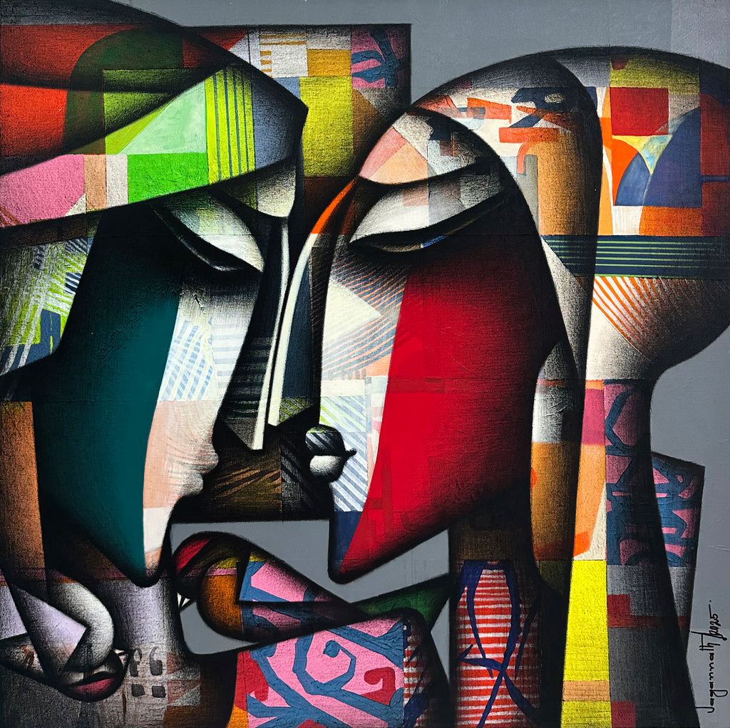 His art is deeply influenced by cubism of the post modern era. Solid blocks of bright colours; red, yellow, and orange is the signature style of Jagannath. Then the deep dark lines of charcoal, start structuring the figurative forms of men and women in his paintings. Thus adding a touch of drama, similar to how kohl adds structure and drama and enhances the beauty of a woman’s eyes. His subjects mostly have straight, long noses, plump lips and big yet closed eyes, perhaps he is illustrating that though beautiful, his subjects are also very thoughtful. The shadowy effect of the charcoal also adds a depth to the painting. Set on a geometric, cubist background, at one time, the artist smudges the charcoal and blends the subjects and the backdrop.