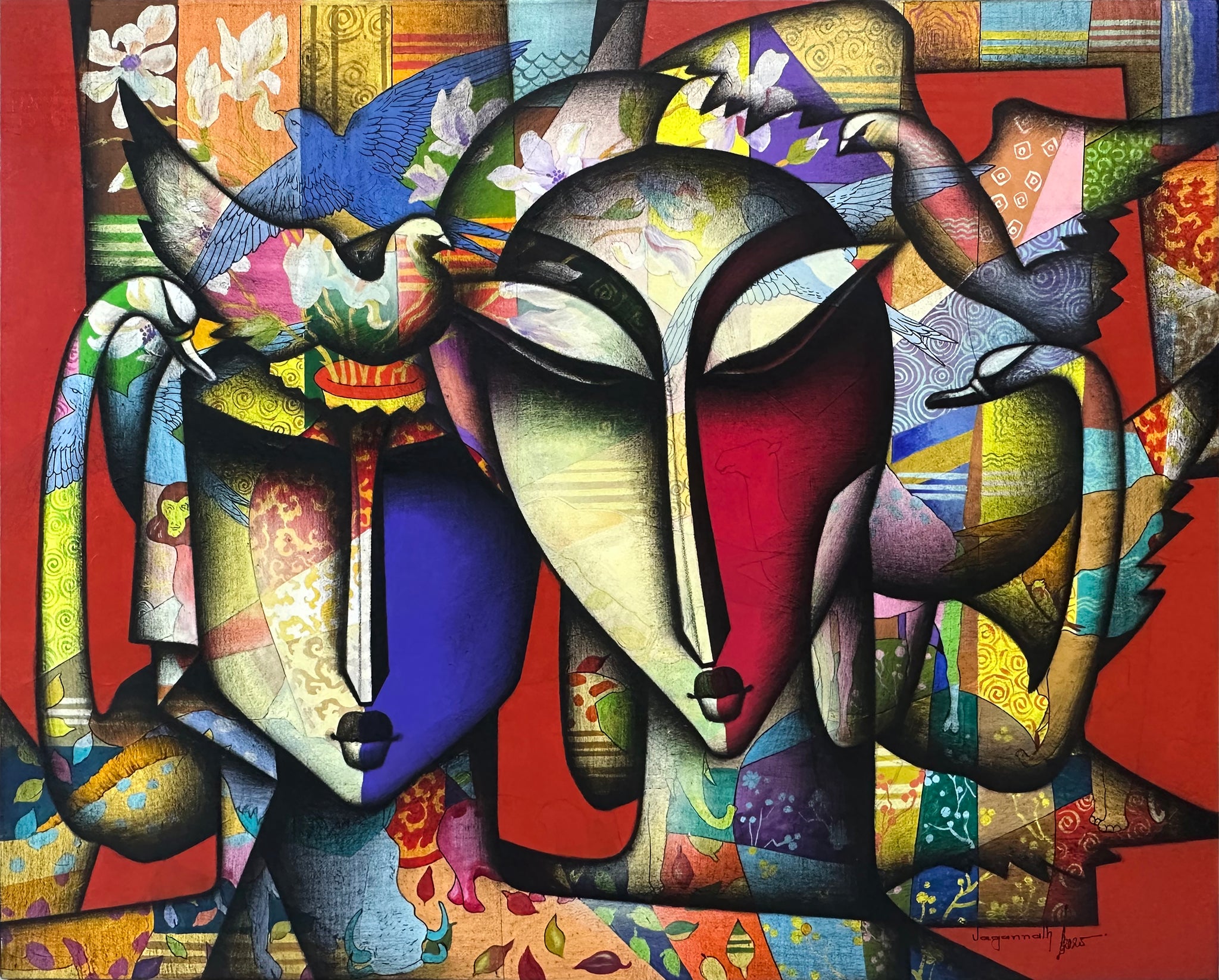 His art is deeply influenced by cubism of the post modern era. Solid blocks of bright colours; red, yellow, and orange is the signature style of Jagannath. Then the deep dark lines of charcoal, start structuring the figurative forms of men and women in his paintings. Thus adding a touch of drama, similar to how kohl adds structure and drama and enhances the beauty of a woman’s eyes. His subjects mostly have straight, long noses, plump lips and big yet closed eyes, perhaps he is illustrating that though beautiful, his subjects are also very thoughtful. The shadowy effect of the charcoal also adds a depth to the painting. Set on a geometric, cubist background, at one time, the artist smudges the charcoal and blends the subjects and the backdrop.