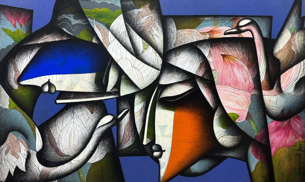 His art is deeply influenced by cubism of the post modern era. Solid blocks of bright colours; red, yellow, and orange is the signature style of Jagannath. Then the deep dark lines of charcoal, start structuring the figurative forms of men and women in his paintings. Thus adding a touch of drama, similar to how kohl adds structure and drama and enhances the beauty of a woman’s eyes. His subjects mostly have straight, long noses, plump lips and big yet closed eyes, perhaps he is illustrating that though beautiful, his subjects are also very thoughtful. The shadowy effect of the charcoal also adds a depth to the painting. Set on a geometric, cubist background, at one time, the artist smudges the charcoal and blends the subjects and the backdrop.