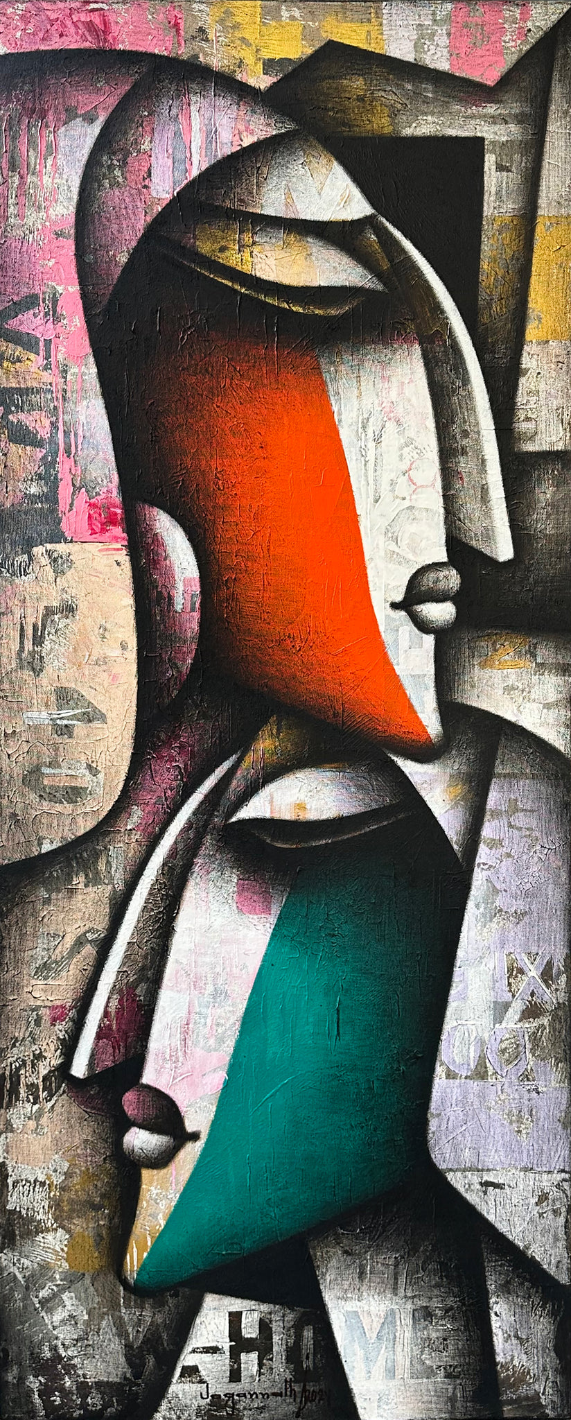 His art is deeply influenced by cubism of the post modern era. Solid blocks of bright colours; red, yellow, and orange is the signature style of Jagannath. Then the deep dark lines of charcoal, start structuring the figurative forms of men and women in his paintings. Thus adding a touch of drama, similar to how kohl adds structure and drama and enhances the beauty of a woman’s eyes. His subjects mostly have straight, long noses, plump lips and big yet closed eyes, perhaps he is illustrating that though beautiful, his subjects are also very thoughtful. The shadowy effect of the charcoal also adds a depth to the painting. Set on a geometric, cubist background, at one time, the artist smudges the charcoal and blends the subjects and the backdrop.