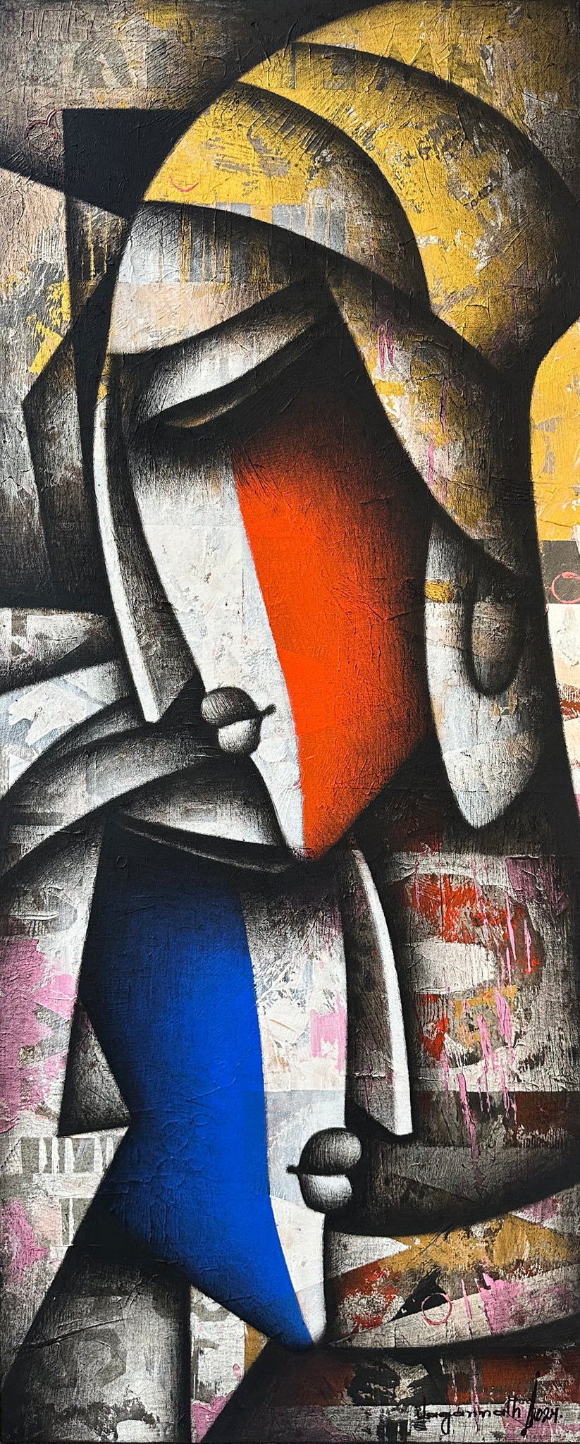 His art is deeply influenced by cubism of the post modern era. Solid blocks of bright colours; red, yellow, and orange is the signature style of Jagannath. Then the deep dark lines of charcoal, start structuring the figurative forms of men and women in his paintings. Thus adding a touch of drama, similar to how kohl adds structure and drama and enhances the beauty of a woman’s eyes. His subjects mostly have straight, long noses, plump lips and big yet closed eyes, perhaps he is illustrating that though beautiful, his subjects are also very thoughtful. The shadowy effect of the charcoal also adds a depth to the painting. Set on a geometric, cubist background, at one time, the artist smudges the charcoal and blends the subjects and the backdrop.