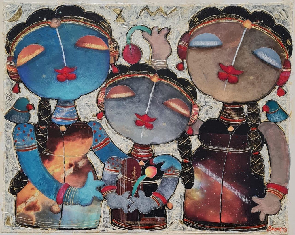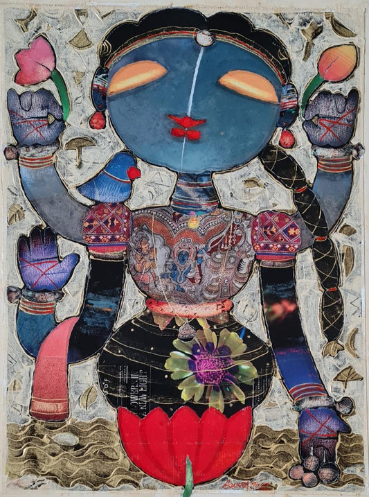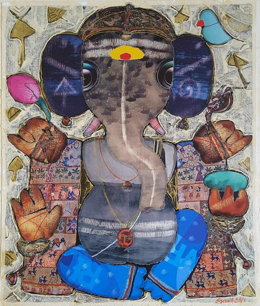 Subramanian’s work is mostly in mixed media and his collages on canvas are inspired by the costumes that his father would wear as a theatre artist. Subramanian is ruled by his emotions and through his art he wants the audience to not only see but also feel his art. He has portrayed Krishna, Buddha, Ganesha and other mythological figures in his work. He uses various techniques, (such as calligraphy), abstract backgrounds, Indian myth and tradition to bring his collages to life.
