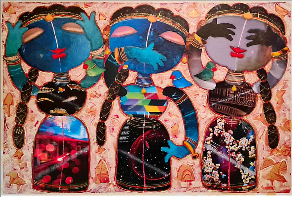 Subramanian’s work is mostly in mixed media and his collages on canvas are inspired by the costumes that his father would wear as a theatre artist. Subramanian is ruled by his emotions and through his art he wants the audience to not only see but also feel his art. He has portrayed Krishna, Buddha, Ganesha and other mythological figures in his work. He uses various techniques, (such as calligraphy), abstract backgrounds, Indian myth and tradition to bring his collages to life