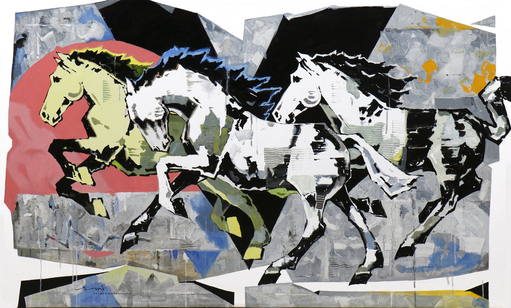 Among the animal kingdom, the horse is the one who is strong, powerful and yet humble and innocent. Like many other artists, poets and writers, Devidas found his muse in steed. He paints these horses in contrasting colours; black and white, brown and cream, red and yellow, perhaps depicting the two sides of the horses, physical vigour and emotional humility. The only thing with real shape and form in the painting is the subjects; the horses. Everything else is abstract. His brushwork that resembles impasto techniques, illustrates the speed and movement one might relate with horses. His impressionist brush strokes along with the flowing mane of the horses and their galloping feet portray the need for speed and freedom every human being craves for.