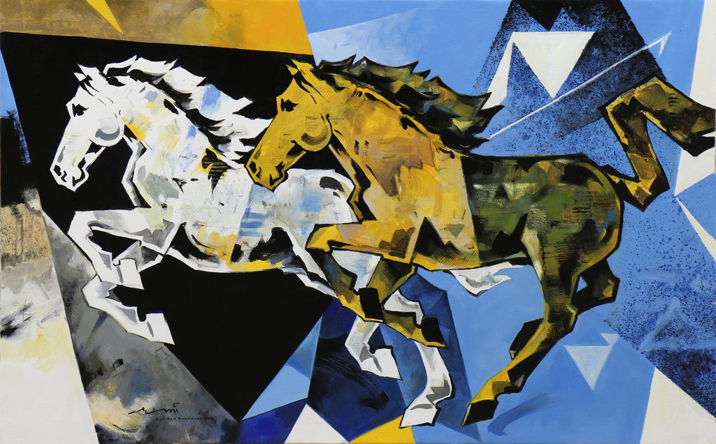 Among the animal kingdom, the horse is the one who is strong, powerful and yet humble and innocent. Like many other artists, poets and writers, Devidas found his muse in steed. He paints these horses in contrasting colours; black and white, brown and cream, red and yellow, perhaps depicting the two sides of the horses, physical vigour and emotional humility. The only thing with real shape and form in the painting is the subjects; the horses. Everything else is abstract. His brushwork that resembles impasto techniques, illustrates the speed and movement one might relate with horses. His impressionist brush strokes along with the flowing mane of the horses and their galloping feet portray the need for speed and freedom every human being craves for.