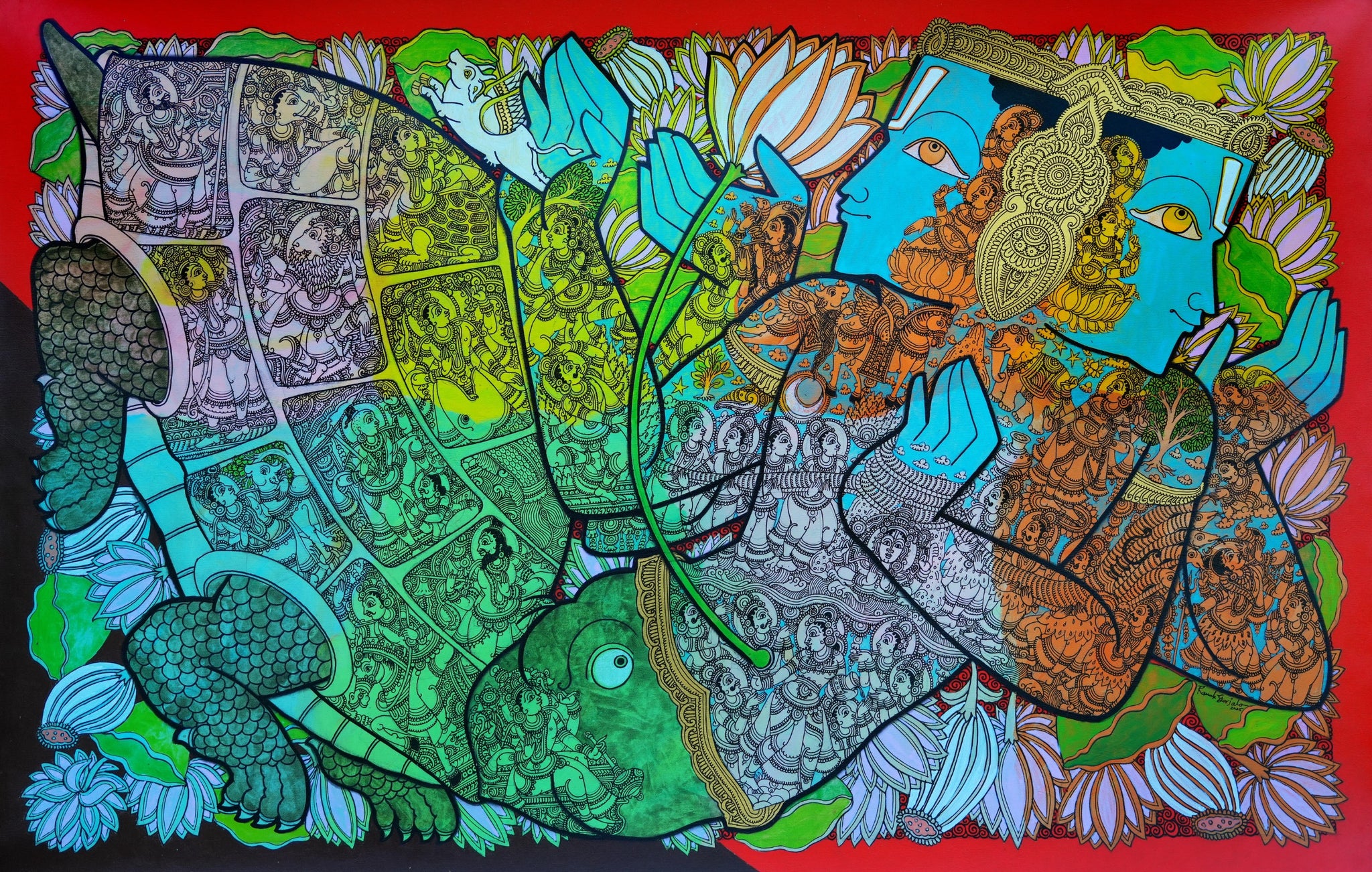 Ramesh found his artistic inspiration in Indian mythology. He recreates Hindu Gods and Goddesses on his canvas, with his own unique and distinct interpretation. Born and raised in Srikalahasti, the artist was naturally inclined towards using the Kalamkari technique in his paintings. Kalamkari is an ancient Indian art form, which is extremely delicate and native to the Srikalahasti region. The artist painstakingly creates different characters such as various forms of Ganesha on his subject; Ganesha. The artist also illustrates different stories from Ganesha’s life in this painting. The use of vivid shades of red, orange, and green blended with the stunning golden yellow, bring life to this astonishingly remarkable painting.