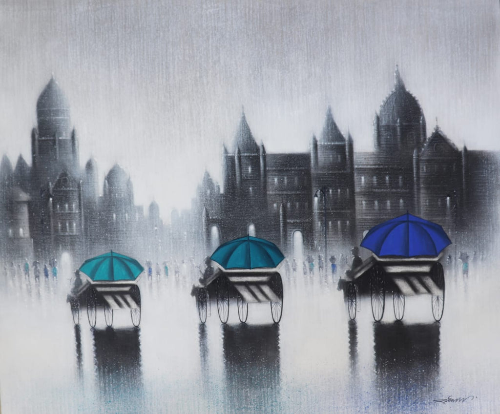 Somnath works with a variety of mediums, including charcoal, acrylic, and mixed media. His work is inspired by timeless locations such as Benaras, Lord Ganesha, and iconic locations in the British Raj era. He has drawn beautiful paintings in different colors paired with black. Yellows, reds, blues are telling of the time of the day, and long towers, running tongas with umbrellas and gateways in different cities. He has drawn Kolkata, Mumbai – taking key historical architecture or city elements and putting them down on the canvas in a unique way, representative of his signature styles.