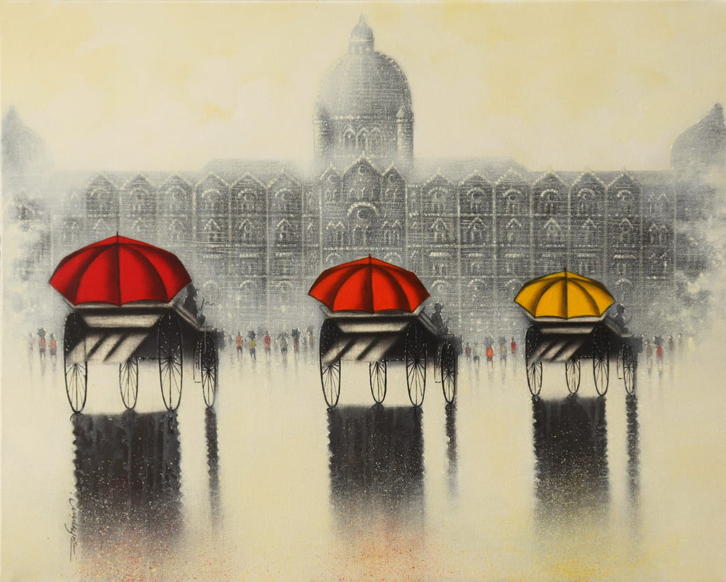 Somnath works with a variety of mediums, including charcoal, acrylic, and mixed media. His work is inspired by timeless locations such as Benaras, Lord Ganesha, and iconic locations in the British Raj era. He has drawn beautiful paintings in different colors paired with black. Yellows, reds, blues are telling of the time of the day, and long towers, running tongas with umbrellas and gateways in different cities. He has drawn Kolkata, Mumbai – taking key historical architecture or city elements and putting them down on the canvas in a unique way, representative of his signature styles.