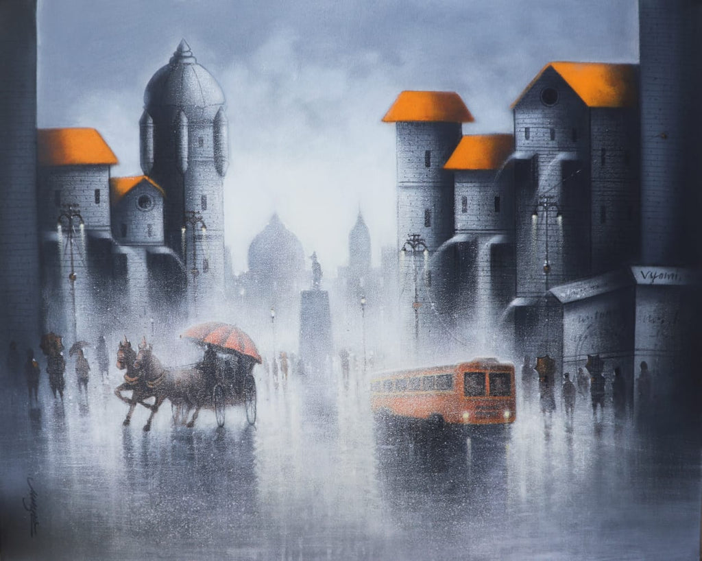 Somnath works with a variety of mediums, including charcoal, acrylic, and mixed media. His work is inspired by timeless locations such as Benaras, Lord Ganesha, and iconic locations in the British Raj era. He has drawn beautiful paintings in different colors paired with black. Yellows, reds, blues are telling of the time of the day, and long towers, running tongas with umbrellas and gateways in different cities. He has drawn Kolkata, Mumbai – taking key historical architecture or city elements and putting them down on the canvas in a unique way, representative of his signature styles.