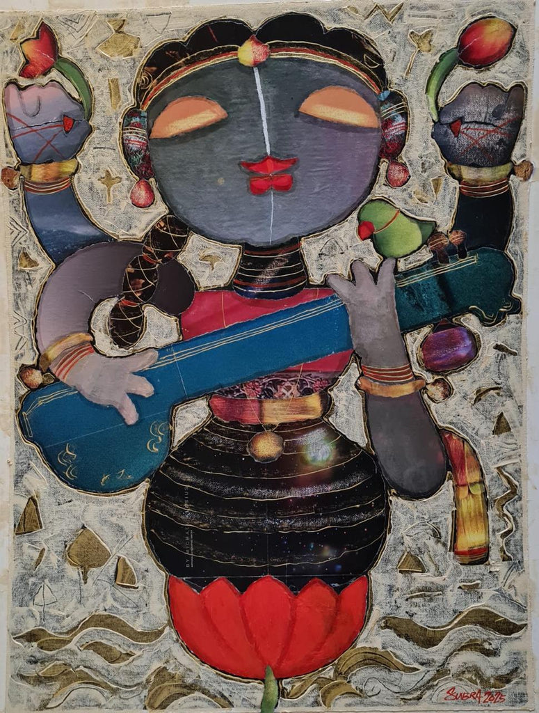 Subramanian’s work is mostly in mixed media and his collages on canvas are inspired by the costumes that his father would wear as a theatre artist. Subramanian is ruled by his emotions and through his art he wants the audience to not only see but also feel his art. He has portrayed Krishna, Buddha, Ganesha and other mythological figures in his work. He uses various techniques, (such as calligraphy), abstract backgrounds, Indian myth and tradition to bring his collages to life.