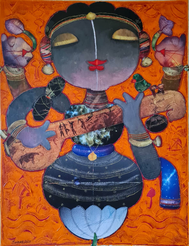 Subramanian’s work is mostly in mixed media and his collages on canvas are inspired by the costumes that his father would wear as a theatre artist. Subramanian is ruled by his emotions and through his art he wants the audience to not only see but also feel his art. He has portrayed Krishna, Buddha, Ganesha and other mythological figures in his work. He uses various techniques, (such as calligraphy), abstract backgrounds, Indian myth and tradition to bring his collages to life