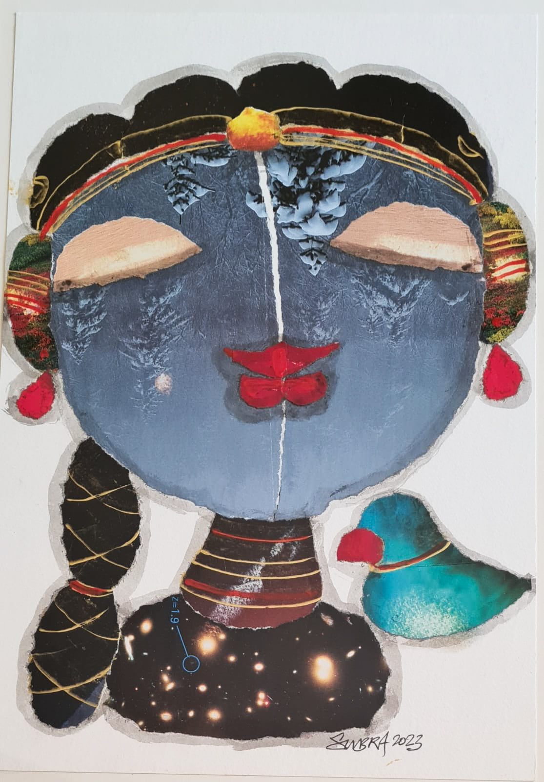 Subramanian’s work is mostly in mixed media and his collages on canvas are inspired by the costumes that his father would wear as a theatre artist. Subramanian is ruled by his emotions and through his art he wants the audience to not only see but also feel his art. He has portrayed Krishna, Buddha, Ganesha and other mythological figures in his work. He uses various techniques, (such as calligraphy), abstract backgrounds, Indian myth and tradition to bring his collages to life