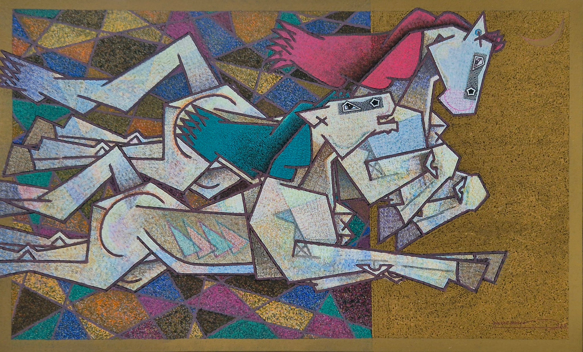 Greatly inspired by nature, Dinkar Jadhav finds his muse in horses. Though one can observe the horses as the protagonist in this painting, the artist’s colour combination, brushwork and various shapes make it look like an abstract art. His brush strokes are angular and sharp that create geo-metric shapes and add a dimension to the painting. Along with this, the artist also engages in impas-to technique, which means layering paint to make it stand out. Dinkar has been fascinated with the play of light on nature, which is why he has a good balance of dark and light tones on his canvas. He divides his canvas in various colour blocks giving his paintings a cubist illusion.