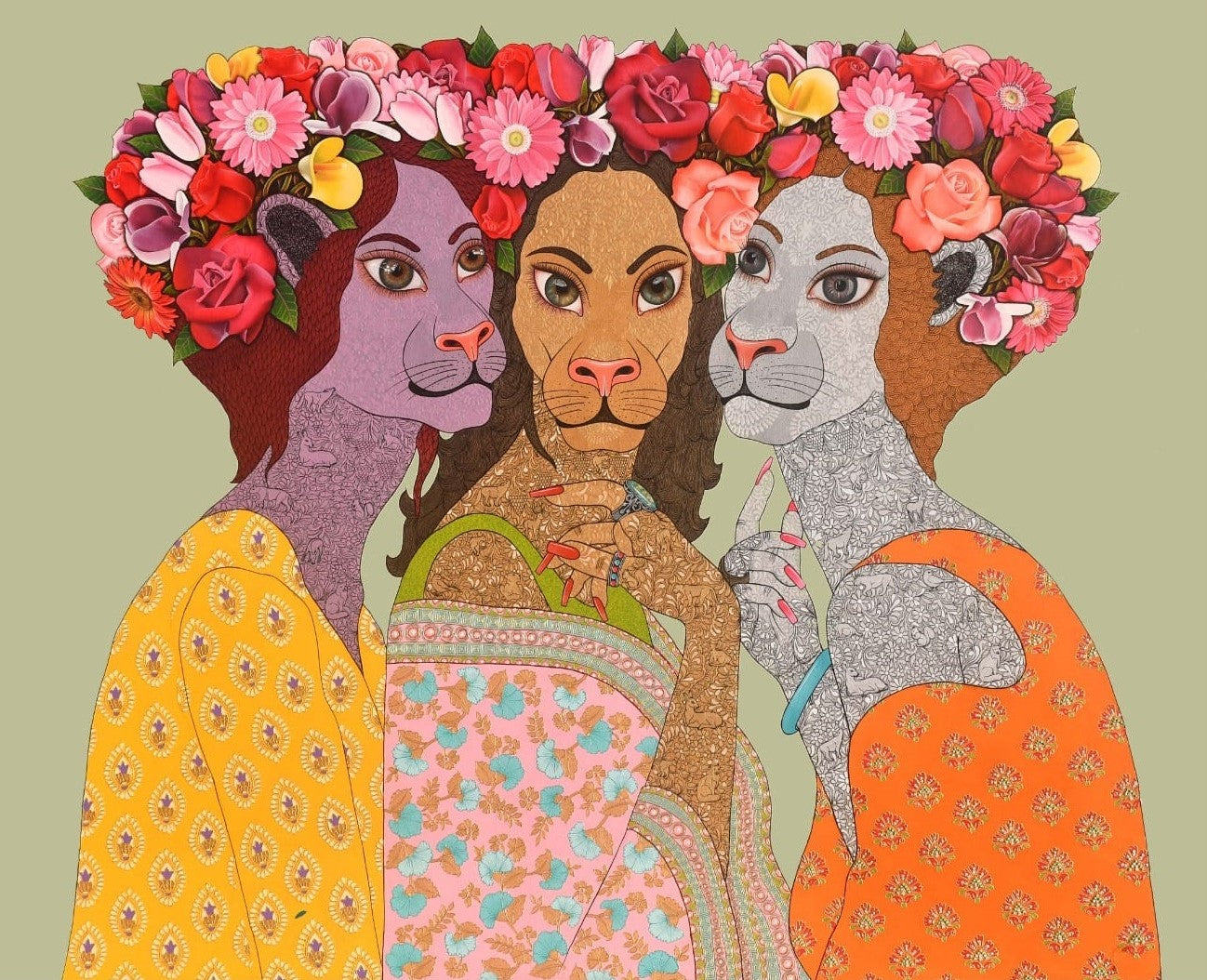 Bandana chooses a bright coloured plain background for her subjects. Inspired by the tribal culture of ‘godana’ or tattooing the body, she then adds intricate patterns to her subjects, comprising of floral vines and animal motifs. Her subjects, a beautiful amalgamation of women and animals —woman’s body with the head of an animal or visa versa— hold a stance as strong as their gaze into the onlookers’ eyes