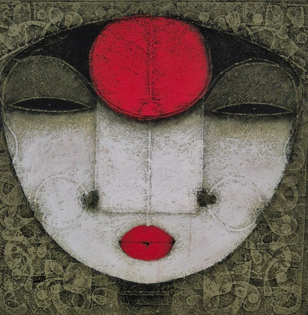 Basuki analogises his muse, Goddess Durga with Indian women, who unlike the Goddess Herself, don’t have numerous hands and strength, but are impeccable at their jobs. They complete their tedious day to day tasks without a single complaint and with mere two arms. Basuki thinks, that in true sense, common Indian women, remind him of the fierce and powerful Goddess Durga. His paintings have a subtle abstract texture in the background. They are full of vivid tones of blue, green, yellow and grey, but the vibrant red lips or huge red bindi on the forehead are the actual focal point of his paintings.