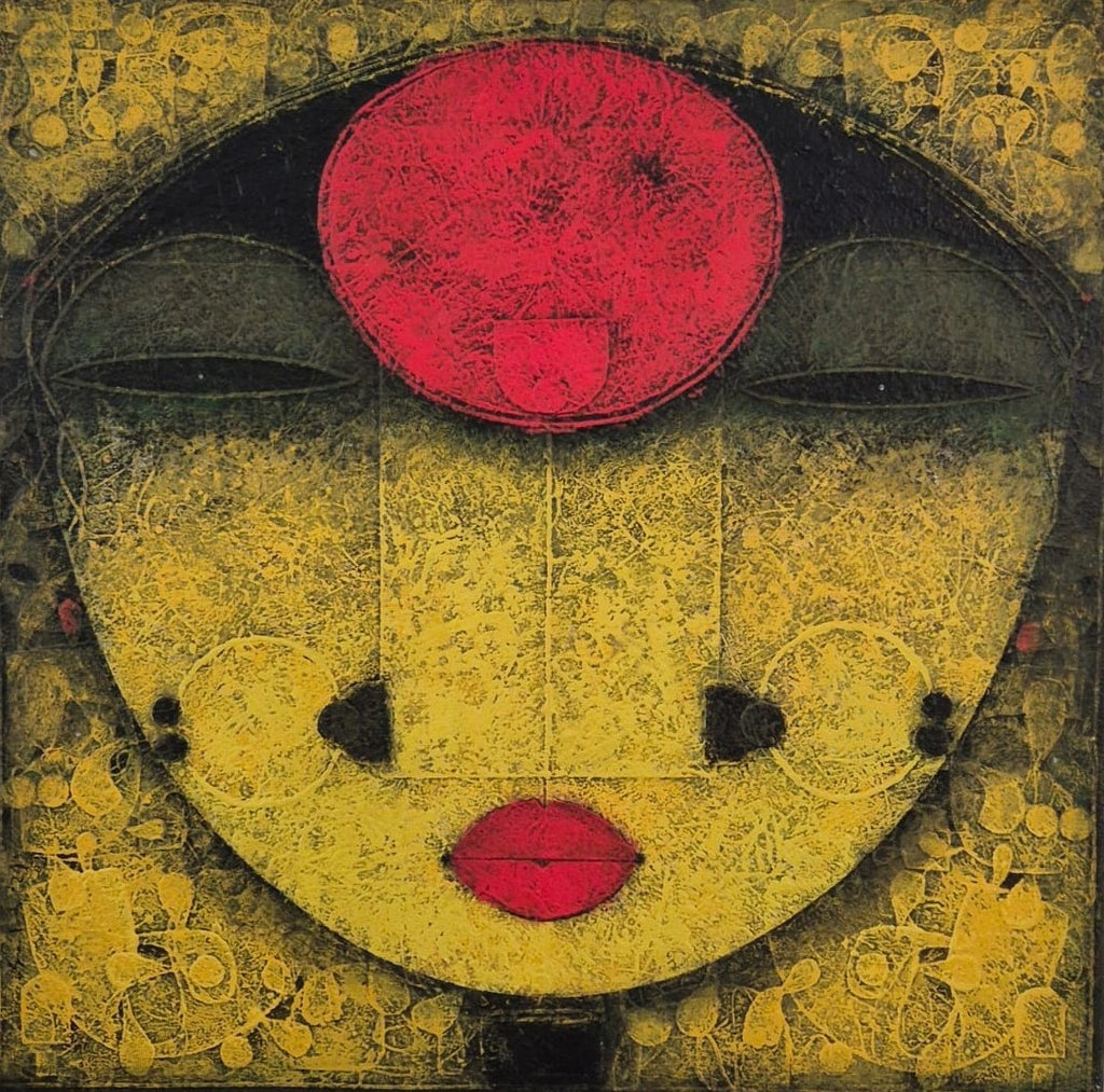 Basuki analogises his muse, Goddess Durga with Indian women, who unlike the Goddess Herself, don’t have numerous hands and strength, but are impeccable at their jobs. They complete their tedious day to day tasks without a single complaint and with mere two arms. Basuki thinks, that in true sense, common Indian women, remind him of the fierce and powerful Goddess Durga. His paintings have a subtle abstract texture in the background. They are full of vivid tones of blue, green, yellow and grey, but the vibrant red lips or huge red bindi on the forehead are the actual focal point of his paintings.