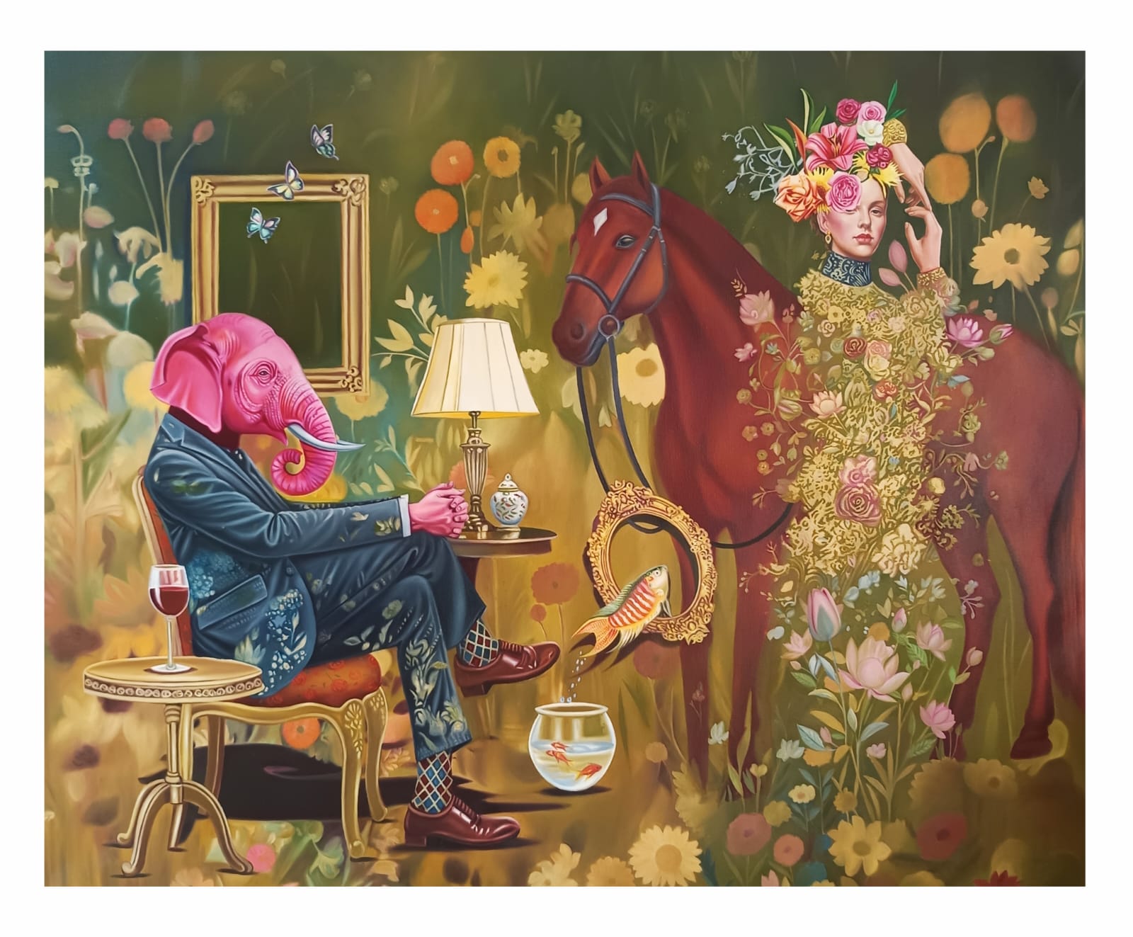 His colour palette comprises of bright and pastel colours and his paintings resonate with magical realism. His subjects; realistic human figures are often seen dancing, their heads are replaced by giant beautiful blossoming flowers, and their arms or dresses are made out of feathers.
