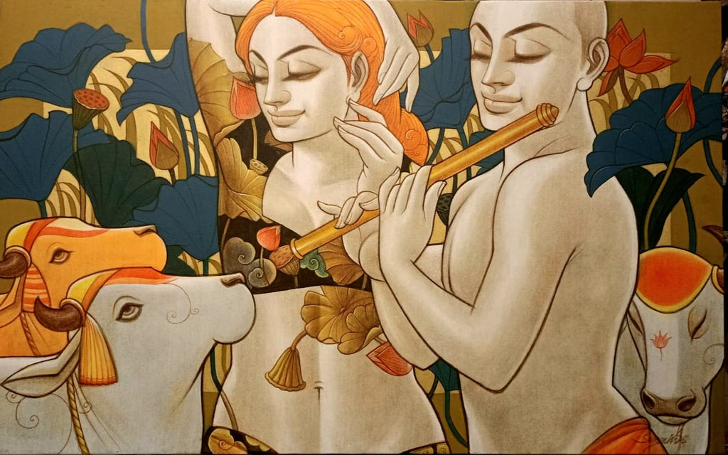 Sukanta draws with mixed media on canvas and is fluent in translating emotions on the canvas. His figures are aesthetic yet inspire the viewer to create stories about the lady. Notice their clothes and the art on them. Inspired by Mughal miniature, Sukanta draws an interesting portrait as if to relate the figure to a distant past or a story. Now, the viewer begins to notice calligraphy in the background and think that the miniatures have been turned on their heads. He as an artist does not seem to be obsessed with the overall message – that he leaves to the audience to extract. However, as an artist, the details do hold his attention, and he renders them beautifully on the canvas. The eyes, smile, and even the eyelashes are beautifully sketched.