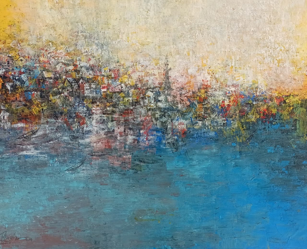 His paintings have a theme of the Indian village or an Indian city, washed in earth tones. He depicts the houses to be physically close to one another despite being numerous. M. Singh uses textures and mixes various colors to give his paintings movement and depth. His abstract art sends the viewer back into a tailspin of stories of their city, home, or village. M. Singh has also painted Maharashtra’s favorite divinity- Lord Ganesha. His colorful rendering is honest and touches the heart.